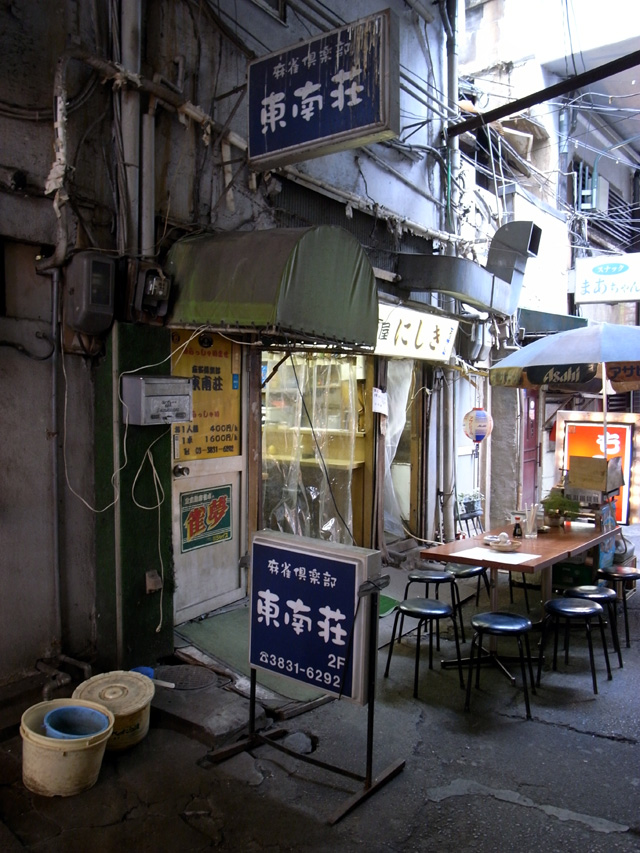お昼頃行ってみたところ時間的にやってなさそうでした。 このあたりはよく歩くんですが、こんな小道があるのは 全然気づいてませんでした。 昼間なのにこの暗さがなんともいかがわしい。 えぇ、ちょっとびびってそのドアを開けることが できませんでした。店長さんの消息は聞けずじまい。
