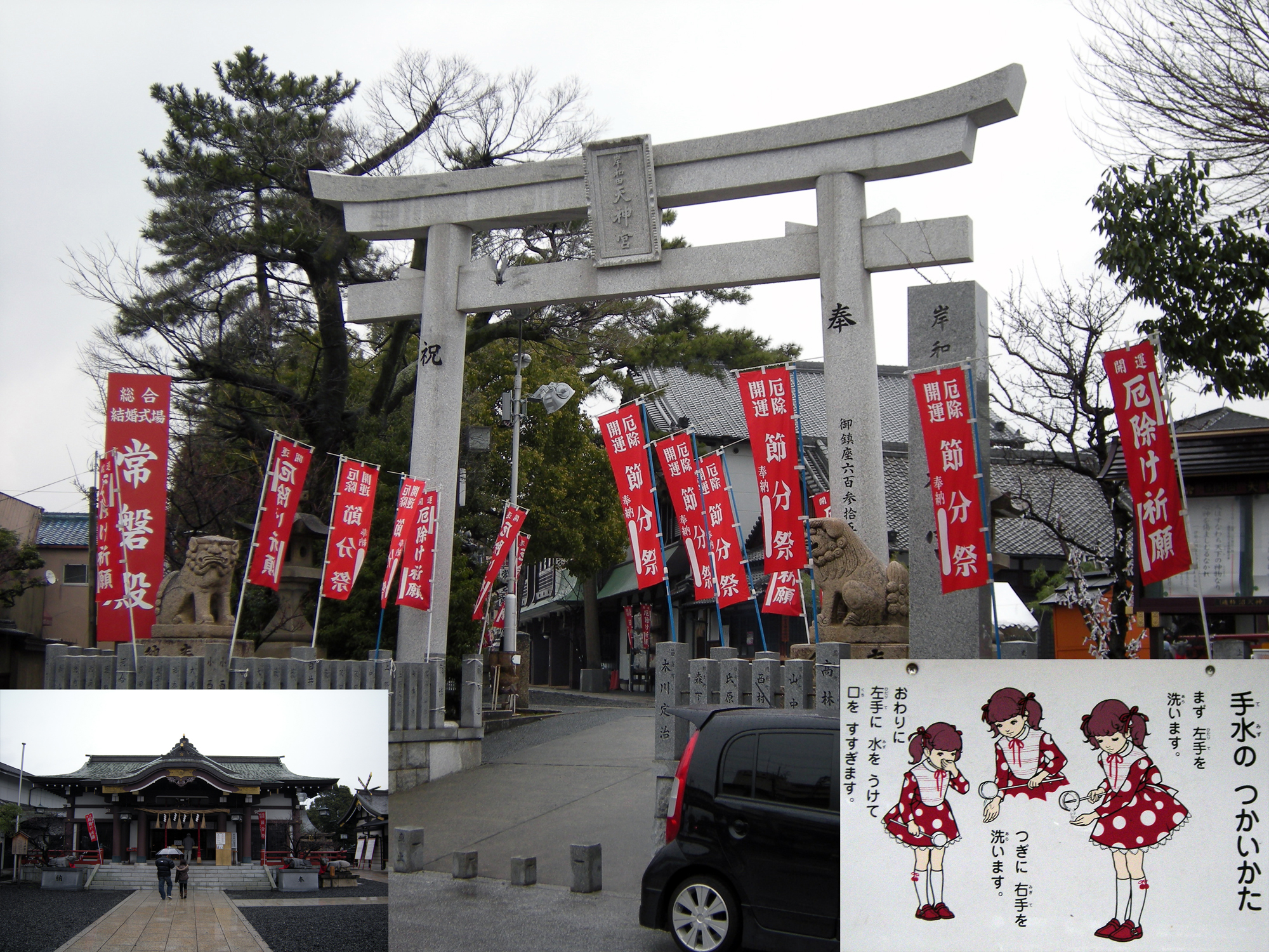 行ってきました。 雨模様でしたが、節分のため、参拝者がちらほらおられました。 あと、神社の周りを一周回ってみましたが、お豆腐屋さんを発見することはできませんでした。 岸和田駅の東側は、高架駅になってから、かなり様変わりしてます。 #写真右下は、他の読者の方へのサービスショットです。