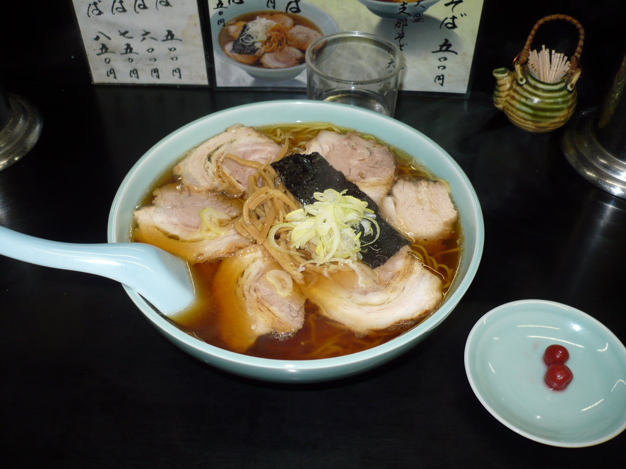 麺は、細麺でスープは昔ながらの醤油スープで、とてもおいしかったです。また、国産豚を使った焼豚がとろける感じでよかったです。昼には、何か丼物がつくらしく、また昼夜関係なく小梅が2個ついてきます。