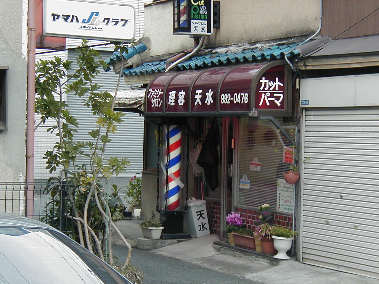 結果からいうと 銭湯は見当たりませんでした。 『理容天水』さんは発見できましたが、向かい側は大西モータースというバイク屋さんで その隣(天水さんの斜め向かい)は、タクシーばかりが停まっている駐車場でした。 もしかしたらこの駐車場が かつて銭湯だった場所なのでしょうか。 写真は、駐車場から撮影した理容天水さんです。こちらは現役で営業中でした。