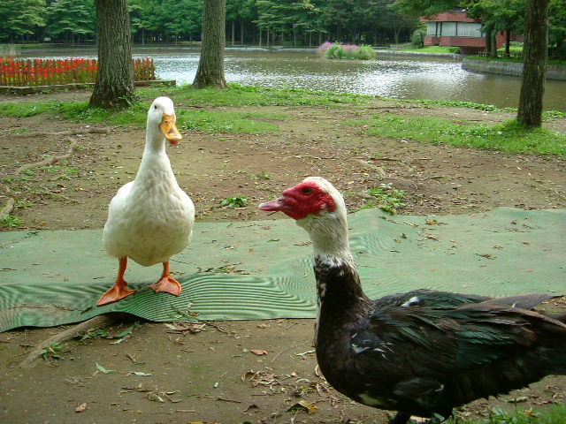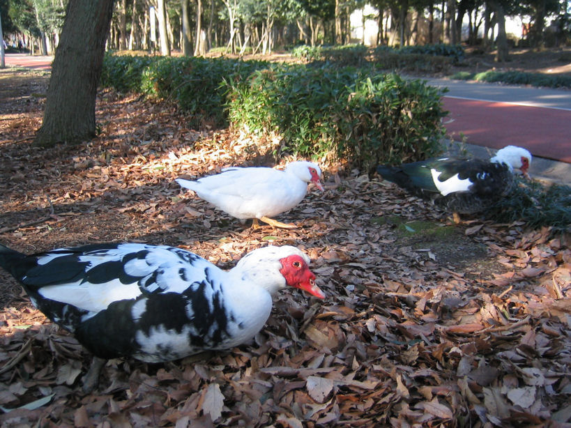 よく遊びに来ていた公園なのですが、そこの池に不思議な鳥がいました。 形・大きさはアヒルのそれなんですが羽の模様がおかしいのです。 赤や黒が混ざり七面鳥のようでした。数も一羽や二羽ではなく、結構な数が群れていた記憶があります。 未だに他では見たことがないので、あれはいったいなんだったのかと気になっています。 見てきてくれたらうれしいです。
