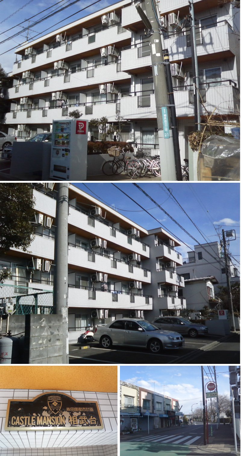 高校を卒業して初めて住んだワンルームマンションです。 キャッスル相武台だったと思います。 3階に住んでいたような記憶があります。 近所の元々八百屋か肉やだった店がコンビニ化した商店や、マンションの裏側の通り沿いにある中華屋、解放日には座間キャンプによく行きました。 大学まで遠くて、なんであんなところ借りちゃったんだろ。
