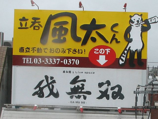 中央線に乗っていると、 阿佐ヶ谷駅でラッパ飲みしているレッサーパンダの絵と、 直立不動でおのみください、と書かれた看板が見えます。 風太くんという立ち飲みのお店のようですが、 お客さんはどれくらい直立不動で飲まれているのでしょうか。 直立不動とか言う割りには実は小さないすがあって、ちょっと腰掛けて飲めたりしないか気になるので、 お時間のある方、ちょっと見てきていただけませんでしょうか。