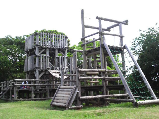 ゴールデンウィークに家族でハイキングに出掛けました。 地元では、気軽に行けるハイキングコースとして結構人気があるようです。 鉄塔のある頂上からさらに30分くらい?歩いたところにありました。 アスレチック自体はたしかに年代物でしたが、今もしっかりと健在でしたよ(^^)