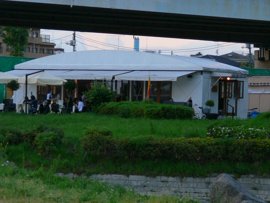 二子玉川の河川敷に、春から秋の季節限定で営業しているイタリアンレストラン。 よれよれと帰宅する電車から、二子玉川の河川敷にぼんやり見える明かりを眺めてなんだかほっとしていました。 一度だけ行ったことがあるのですが、多摩川から夕暮れを眺め、風に吹かれながら食べるピザは大変おいしゅうございました。 去年3月に横浜を離れたので去年の開店に間に合わず、心残りでした。 今年はもう開店してる頃だと思います。 どなたか見てきてもらえたらうれしいです。