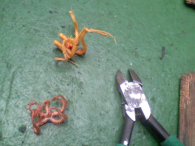 先週、とある調査船で水深1000mに設置していた海底装置を回収したところ、ヒトデが装置のスキマにはさまったままでした。クモヒトデ?でしょうか。きっと住み心地がよかったのでしょう。悪いことをしました。ごめんね、といいながら海に帰しました。ちゃんと海底までたどり着いたかな… https://goto33.blog.so-net.ne.jp/