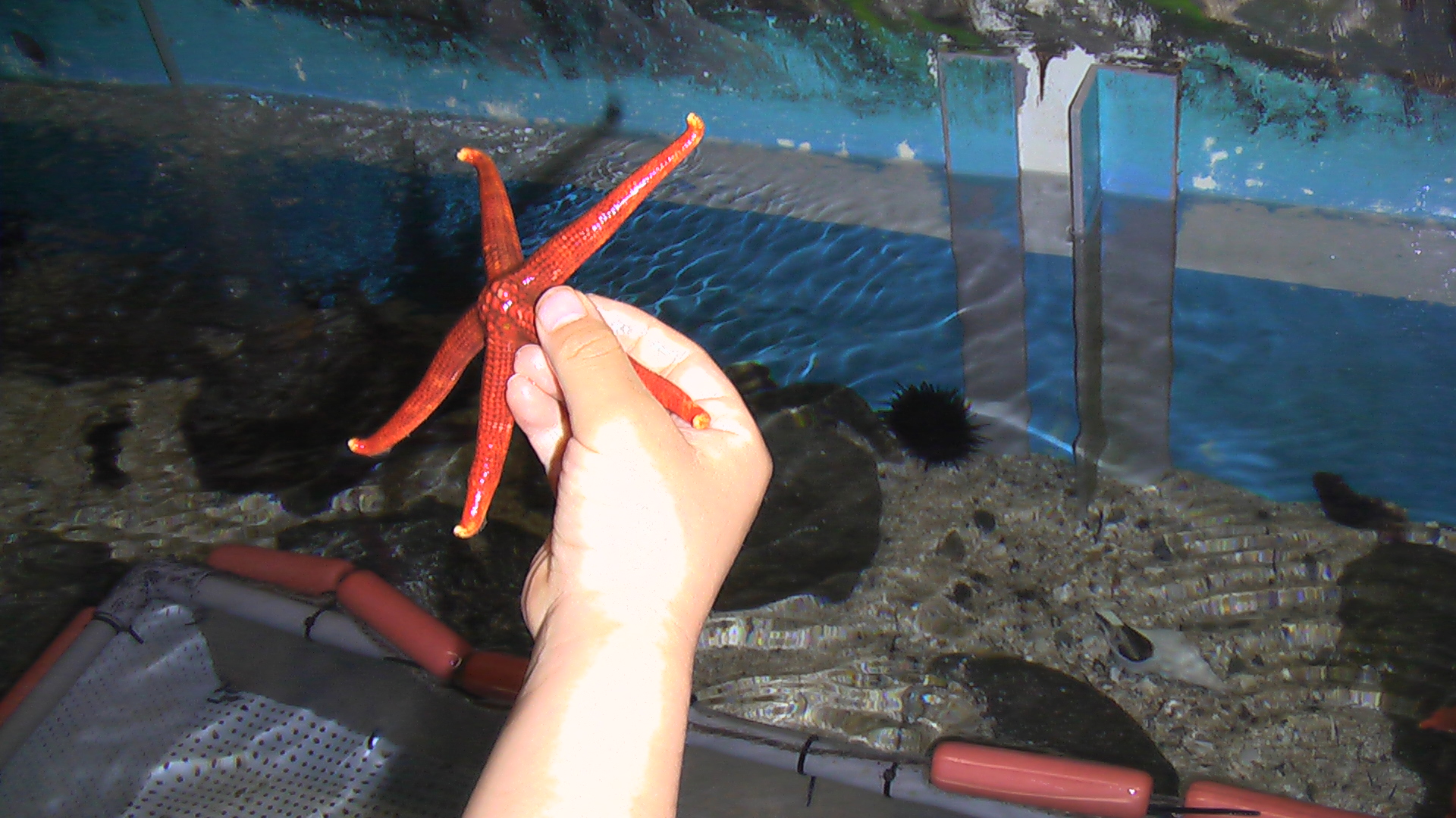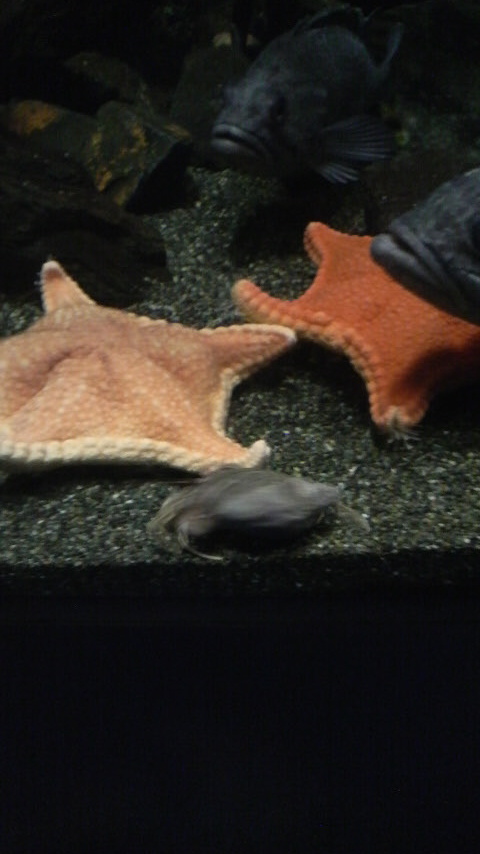 新江ノ島水族館のヒトデさんです。 寄って撮ろうとしたら、魚がフレームの前で立ち止まってしまい、中途半端な感じです。 写真はNG,事務所を通してください!って感じでしょうか。