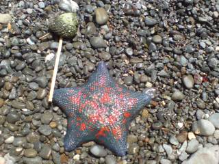5/4…和歌山の加太で見つけました。 磯で、石をめくるとたまにいます。 触ると結構、ざらざらしています。 貝拾いの獲物「ガンガラ(この辺りでの呼び名)」と一緒にパチリ☆「貝、獲ったど〜」