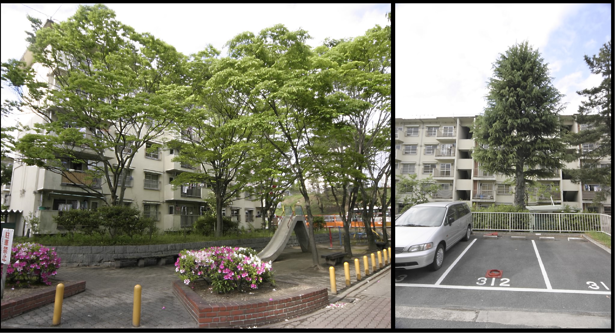 鶴舞団地の27号棟を見てきました。 団地の裏には杉はありませんでした。 団地の表側には杉ではないですが針葉樹がありました。 とりあえず両方の写真を載せておきます。 鶴舞団地は建て替え事業が始まっており、20号棟くらいまでは 更地になっています。27号棟も近いうちに取り壊されると思います。