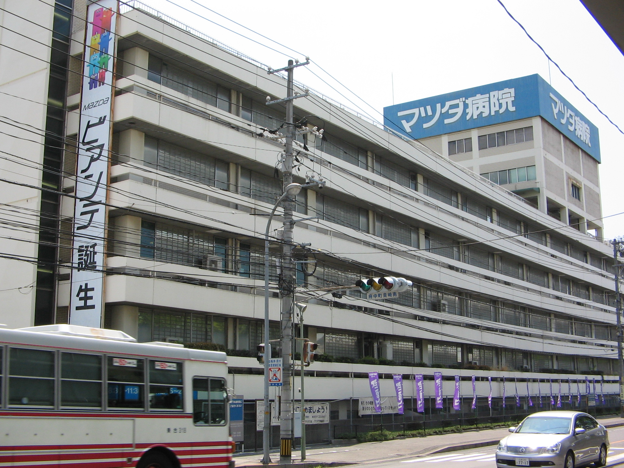 広告幕、ちゃんとありますよ。 と、いうか、「マツダ病院」は自動車メーカー「マツダ」の附属病院なので自社製品の広告掲出に利用するのは当然ではないかと。 (ちなみに、この病院は一般の方も受診できます)