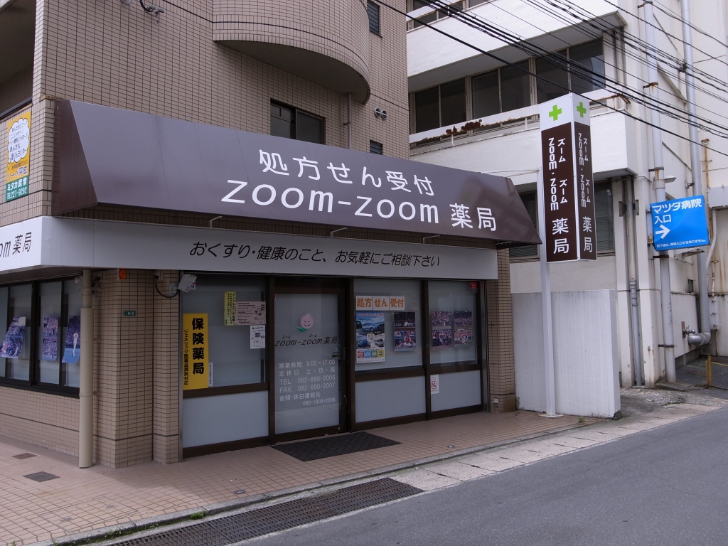 そのマツダ病院の裏には「ZOOM-ZOOM薬局」という薬局があります。 病院の向かいにマツダの本社があります。