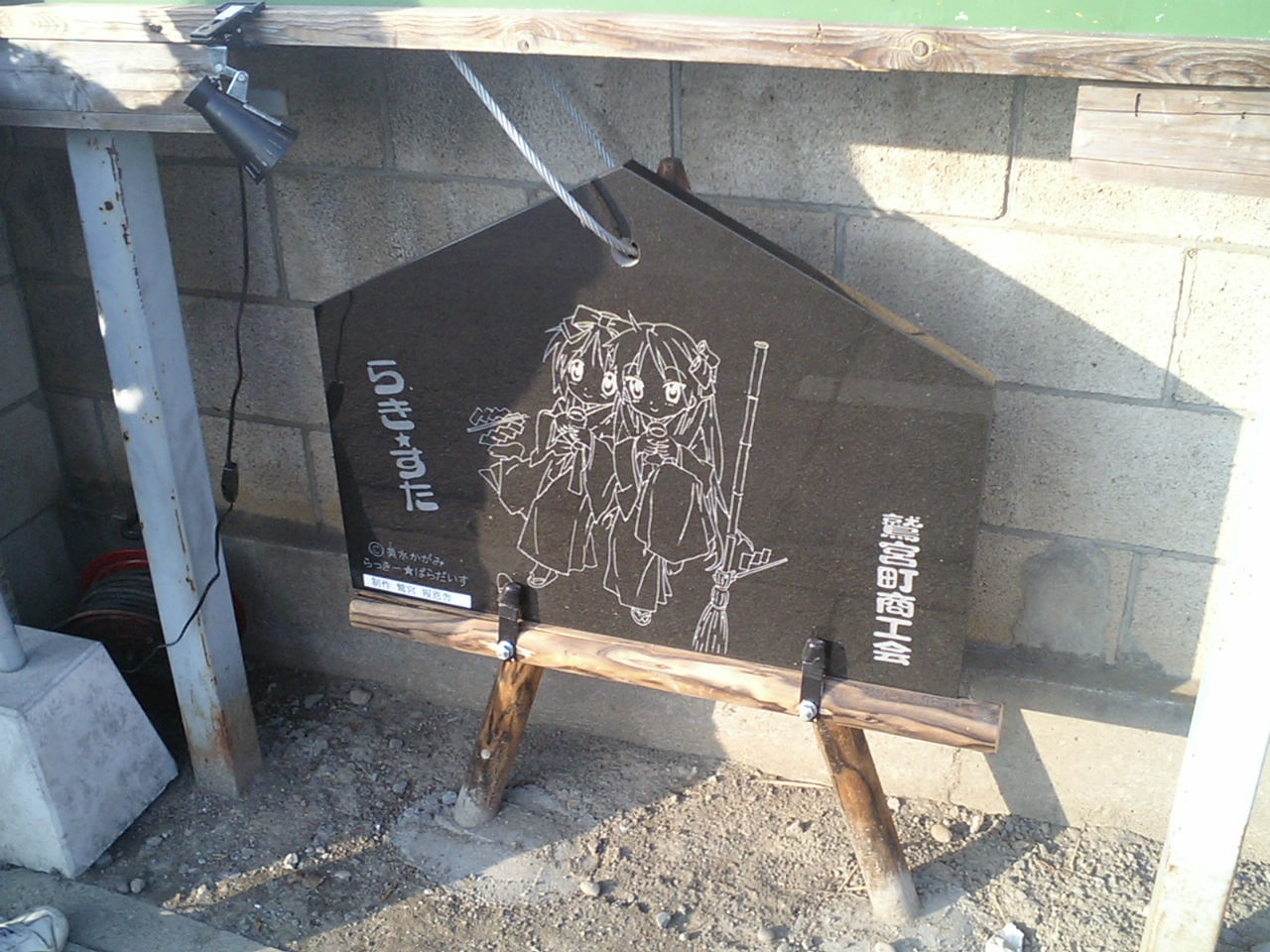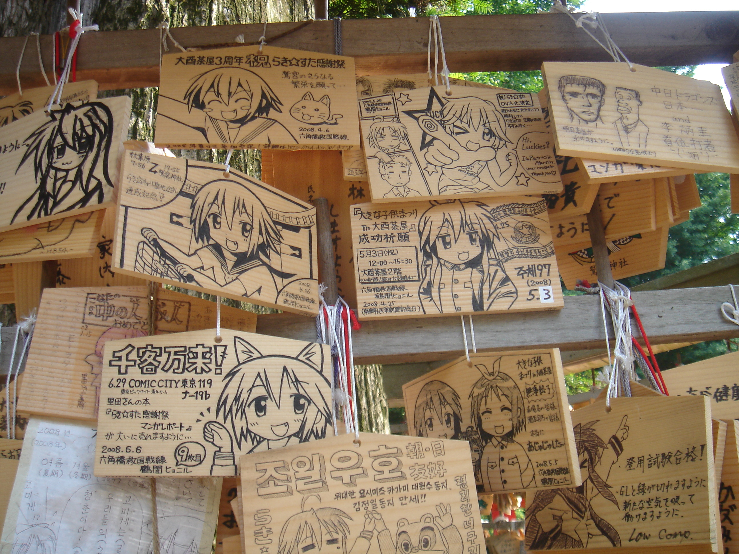ちょうどそーいったのが好きな方々のOFF会らしきものに遭遇しました。皆さん車や自転車をいわゆる痛車にカスタムしていました。個人の車の画像なので乗せることはできませんが、なかなかみなさん凝っていました。 写真は絵馬です。