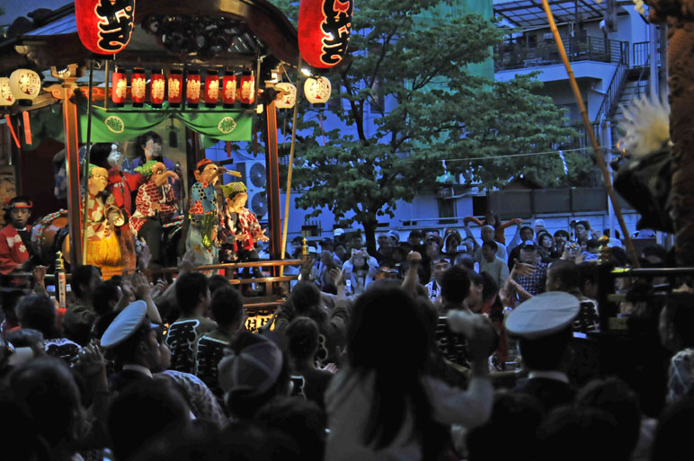 山車が旧甲州街道を通る時は、ぐるーっと迂回しないと横断出来ません。 しかも沿道は見物客がビッチリいてもの凄く歩き辛いので、裏道を回らないといけません。 写真は、旧甲州街道の魚屋さんの辺りで撮った物です。