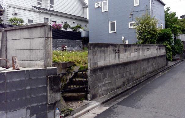 アパートの階段が残っていました。 おそらく母君さんも毎日この階段を利用されていたのでしょう。 コンクリートに囲まれたあと地には草花が咲いていました。 付近は幅4〜5メートルの曲がりくねった裏通りが走り、 地図がなければ分かりにくい場所でした。 庭の広い大きな邸宅が多い地域でもあります。