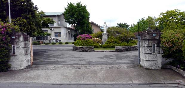 広い敷地の幼稚園ですね。 ご近所ではこの幼稚園に通われる子が多いようです。 建物は新しいので当時とは違うかも知れません。 敷地内に数本の松がありますね。 年輩の女性に聞くと、昔は松の林と竹林が鬱蒼としていて、 近所の人の散歩の場所でもあったようです。 見に来たのは日曜日で、子供たちの姿はありません。
