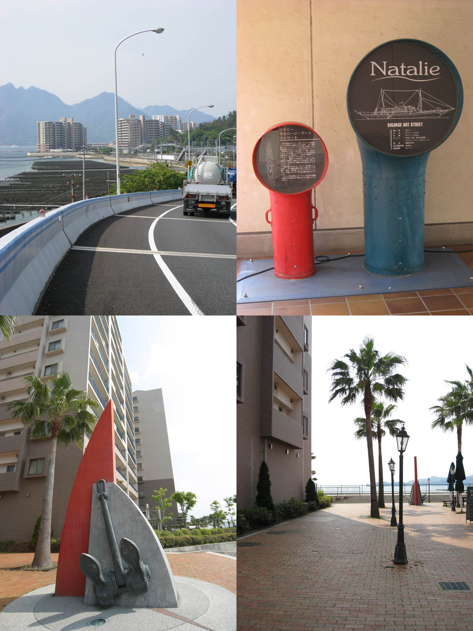 右上・左下:「フジグラン」の建物周辺には「ナタリー号」の構造物を利用したモニュメントが。