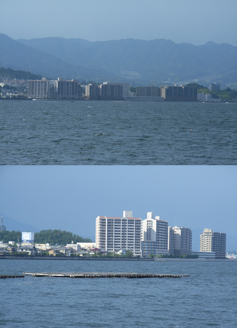 左上:西広島バイパス下り線(出口付近)よりナタリー跡地を望む。かつて左端のマンションあたりに「海上コースター」の白い支柱がありました。