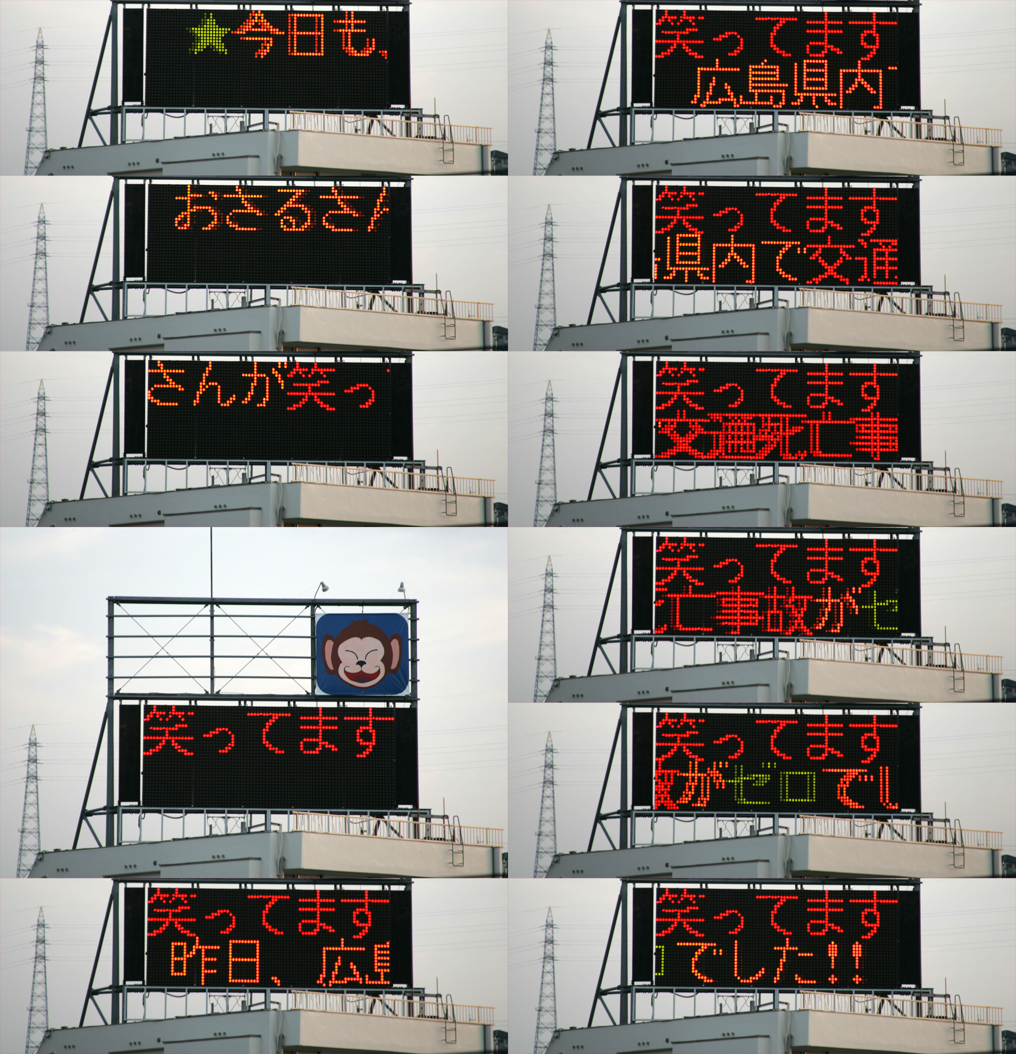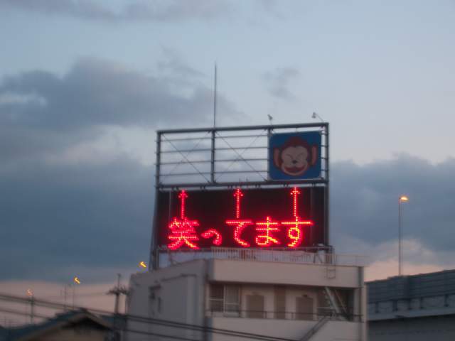 写真がないので残念ですが… あのおサルさん、台風などで飛ばされる危険がある時には、看板が無くなって「今日は、おサルさん、台風が来るので、避難しています」とか、多分メンテナンス上の都合だと思うのですが、看板を降ろされている時には「今日は、おサルさん、休養のため温泉に行っています」なんて電光掲示になるんですよ。