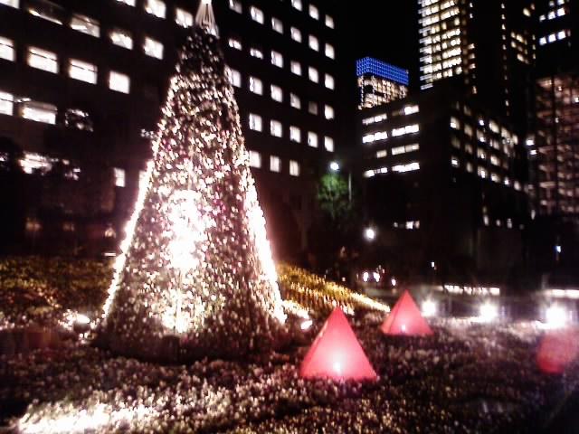 職場が近くなので、時々みてます。が、写真は撮ってないんですよね。 とりあえず、昨年末のイベントで、ライトアップされていたときの写真を(ぶれてますが)。 広場には水のオブジェがあって、カルガモの姿を見ることもありましたが、最近は水は止められてるみたいで、ちょっと残念な感じです。