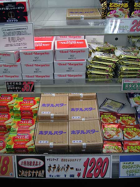 世田谷区下北沢、オ*ゼキの本日の模様です。 マーガリン売り場とチーズ売り場が異常に拡大しているのが印象的でした。 こちらも「バターはお一人様一つ」掲示あり。 ●はちみつバター ●レーズンバター ●ガーリックバター は特に高価でも無い感じで数も普通にありました。 が、純粋なバターは ●ホテルバター/8g × 50個 1280円 のみでした。 例の紙箱に入った通常仕様のバターはもはや下北沢ではレアアイテムと化しているのかも知れません。