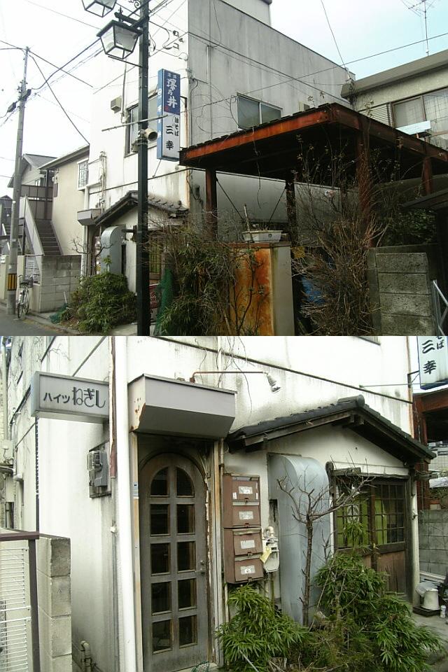 「三幸」が開店する前に行ってきました。 お店の前はこうでした。一階入口の右にも左にも、それらしい外階段はありませんでした。撤去されたのかな?