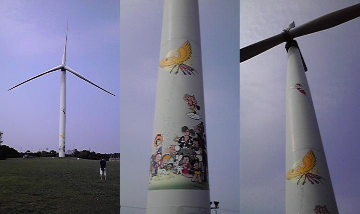 左から全体、足元の絵、すこし離れたところの3枚です。 お盆に入ったせいか今日はまわっていませんでしたが、 風車の周囲にある芝の広がる公園には小さなお子さんを 連れた家族連れが少しいました。