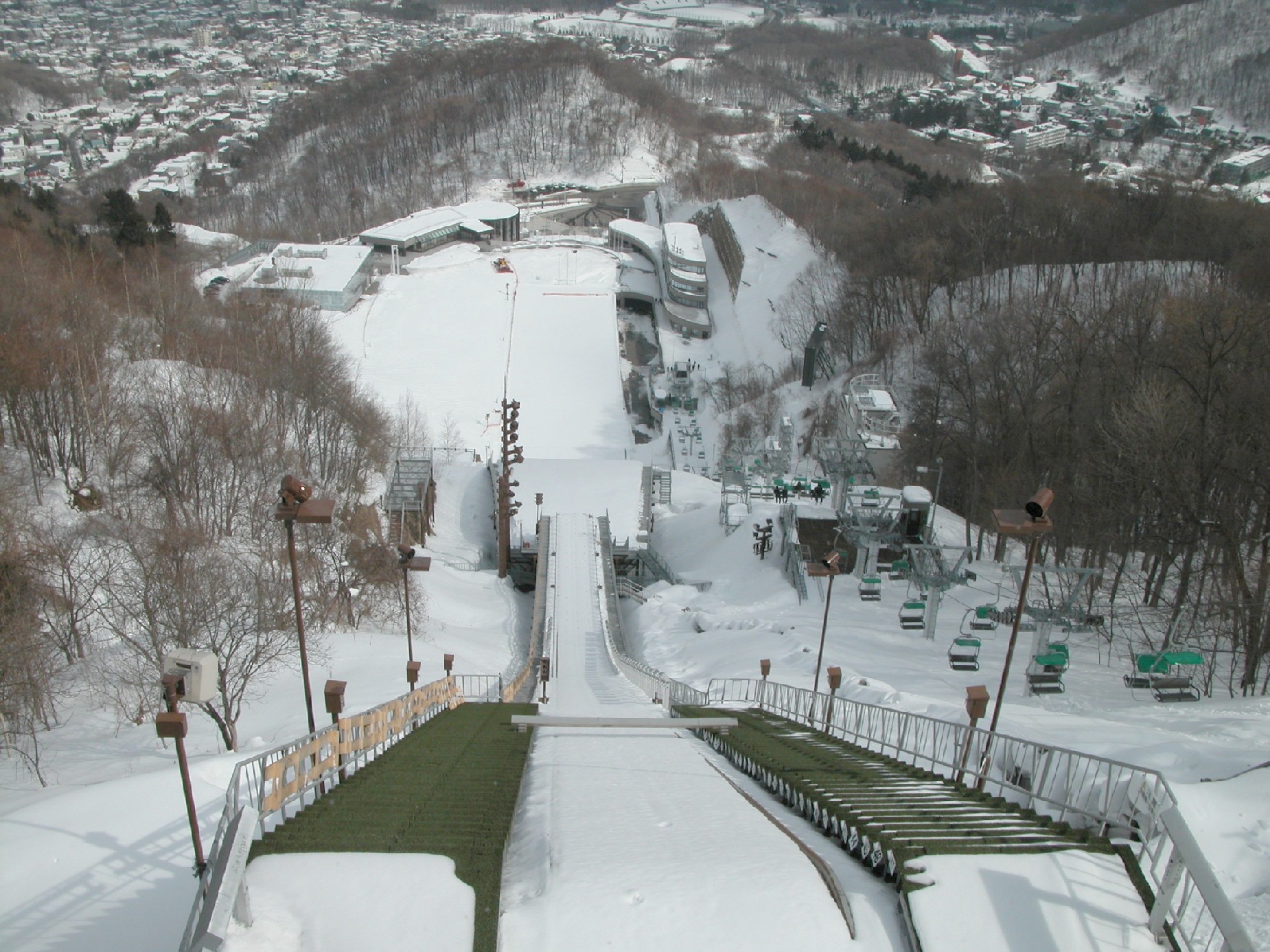 大倉山ジャンプ台は冬でも吹雪いてなければリフトで展望台へ上がれます。 私は市街地よりも自分の足元の景色に釘付けでした。 テレビで見てると滑り台を滑り降りてくるように見えますが 実際にはこんな急斜面、奈落の底に落ちる感じです。