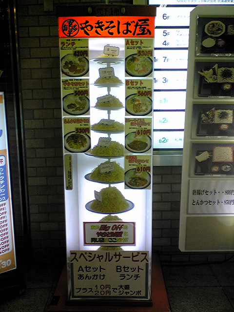 おっしゃるとおり、ショーケースにだんだんとでかくなる焼きそばが縦に並んでおりやした。お腹が減ってたのですが、このショーケースを縦から順番に眺めてたら、次第に胸がいっぱいになって、結局何も食べないで会社に帰りました。ここってもしかしたら、究極のダイエットスポット…しかもプライスレス!