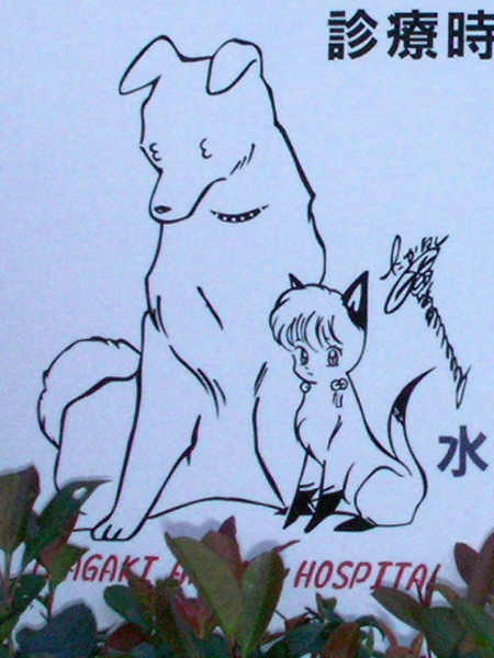 以前訪れたときにドカベンバスには 出くわしたのですが、写真は撮りそびれました。 犬夜叉バスは、現地の友人が「自転車(本人)の 後ろから来ると、犬夜叉に追われている気分になる」 と話していました。 話のついでに、市内にはこんなものも。 動物病院の看板です。