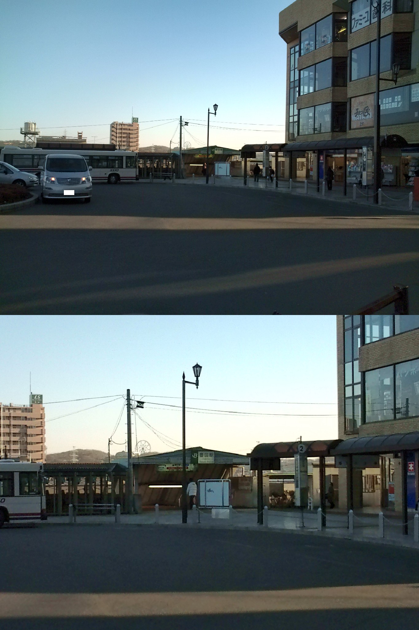 駅前のロータリーです。 遠くには、2009年9月30日で閉園が決まった「多摩テック」の大観覧車が見えますね。