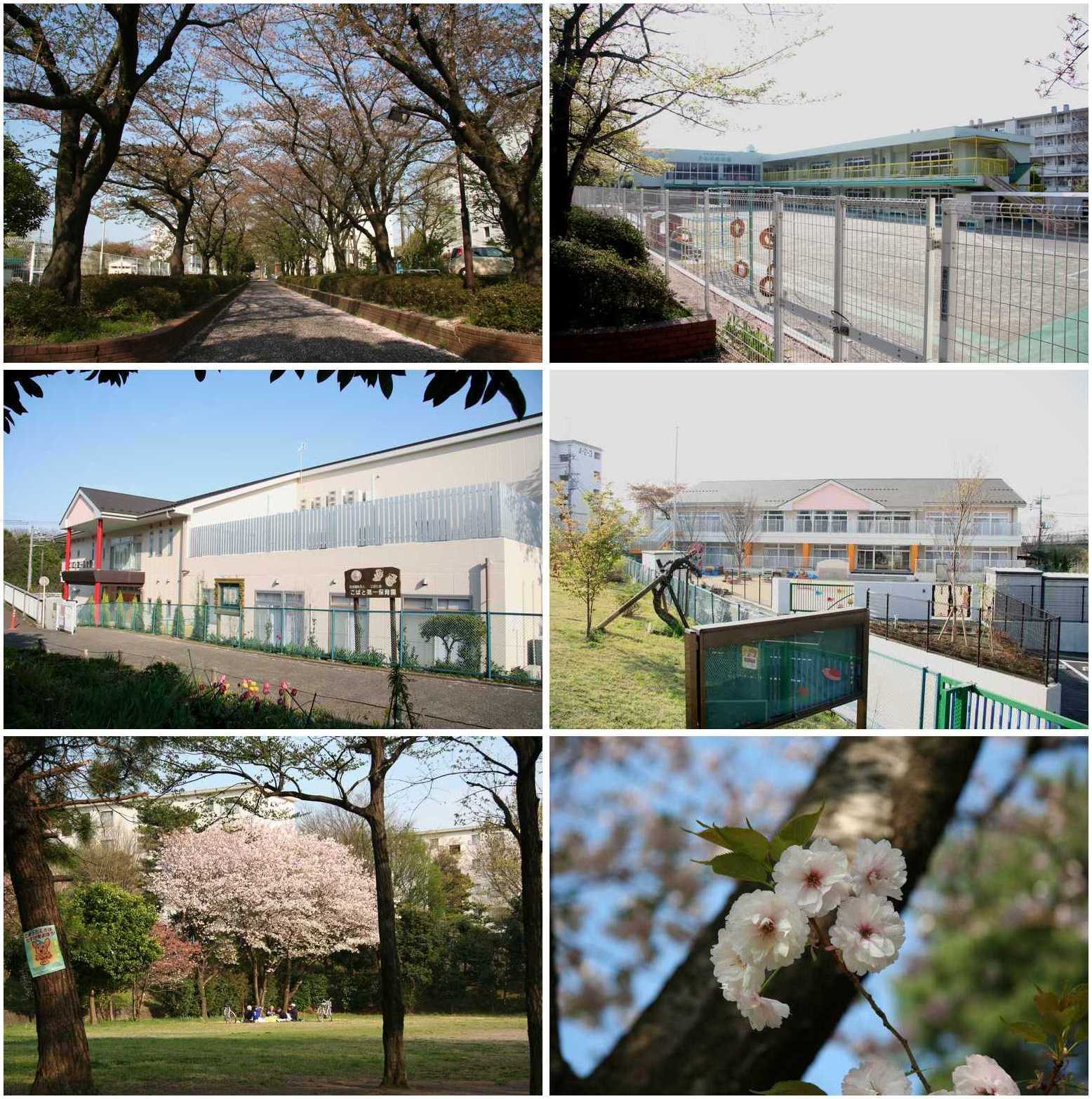 見に行ったのが4月12日だったため、桜はだいぶ散ってしまった後でした(すみません)。すぐそばの公園にある八重桜は、ちょうど見頃でした。 [写真] 上段:通りと幼稚園 中段:保育園 下段:公園の桜