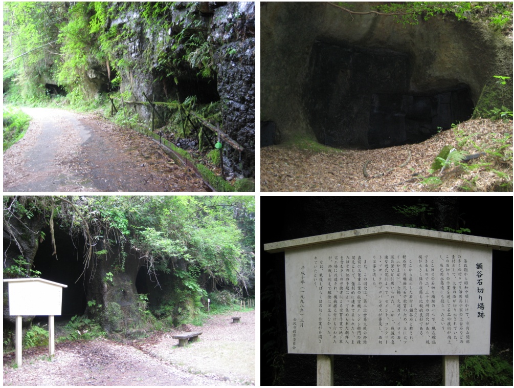 徒歩で先に進むと先程よりも大きな洞窟がたくさん並んでいる場所があり、立看板に「額谷石切り場跡」とあり、藩政期から昭和中期まで、主にかまどや七輪に使うための石を切り出していた跡とのことでした。