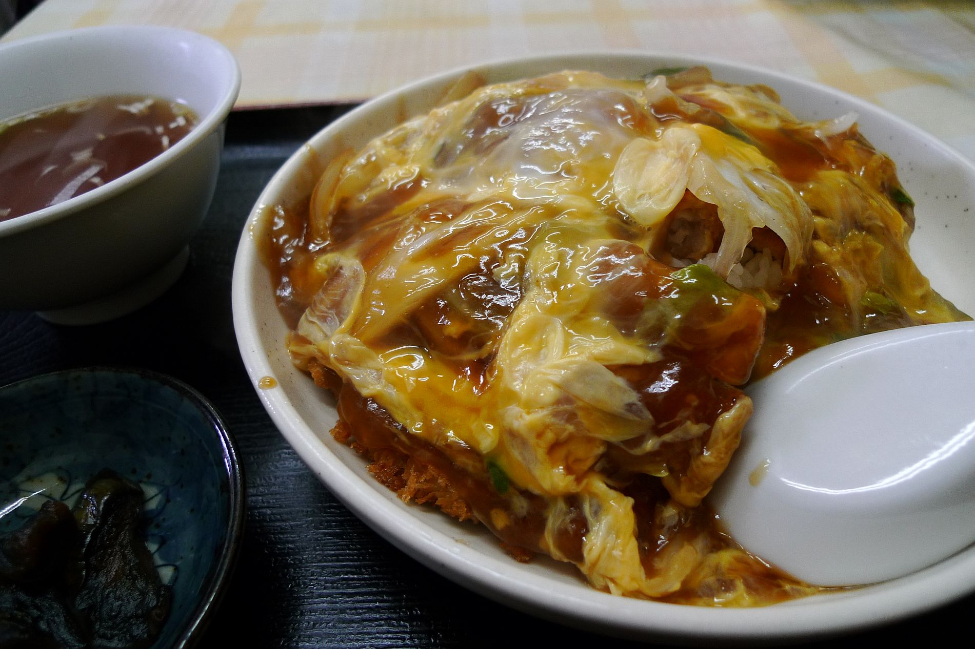 メニューには「カツ丼」としか書かれておらず恐る恐る注文。 まさか丼ですらないとは思いませんでした。 サクサクのカツと白菜と卵の入った中華風の餡が美味しかったです。