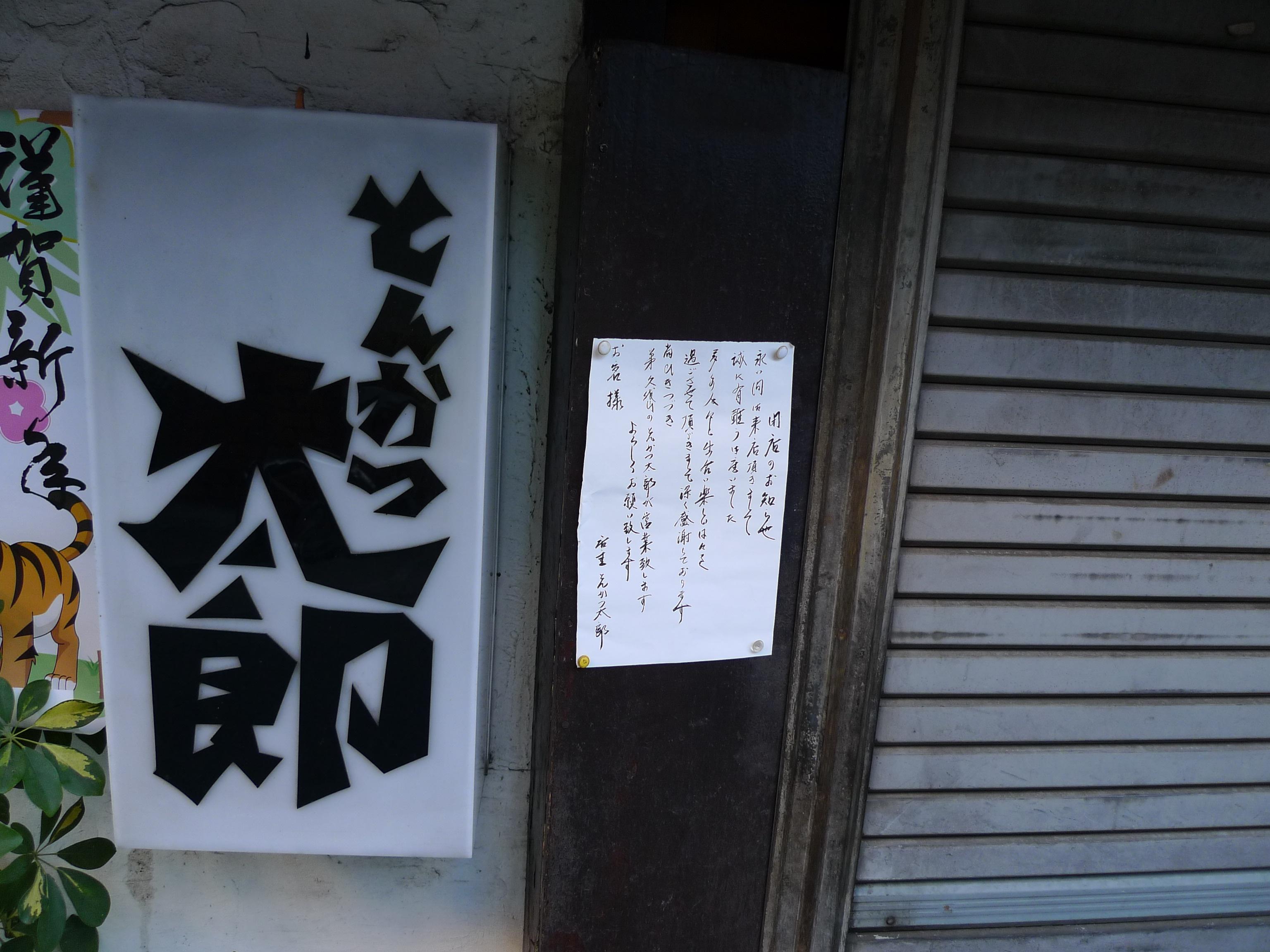 2010年の元日に近所を散歩していたら、閉店していました。 久我山に弟さんのやっている別な「とんかつ太郎」があるようです。