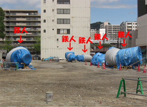 ほぼ毎日、現場脇を通っています。 黄色い重機の手前に建設(?)されます。今は足の下の基礎工事が終わった段階で、周りには鉄人のパーツの一部(ブルーシートのかかった灰色の物体)が置かれています。