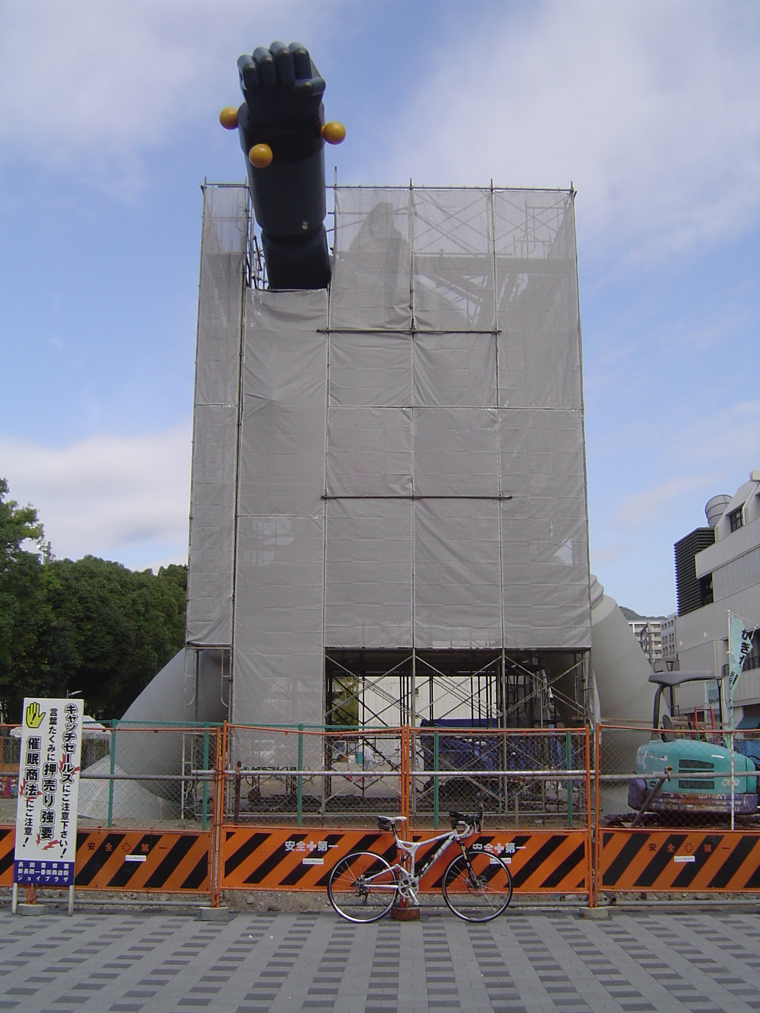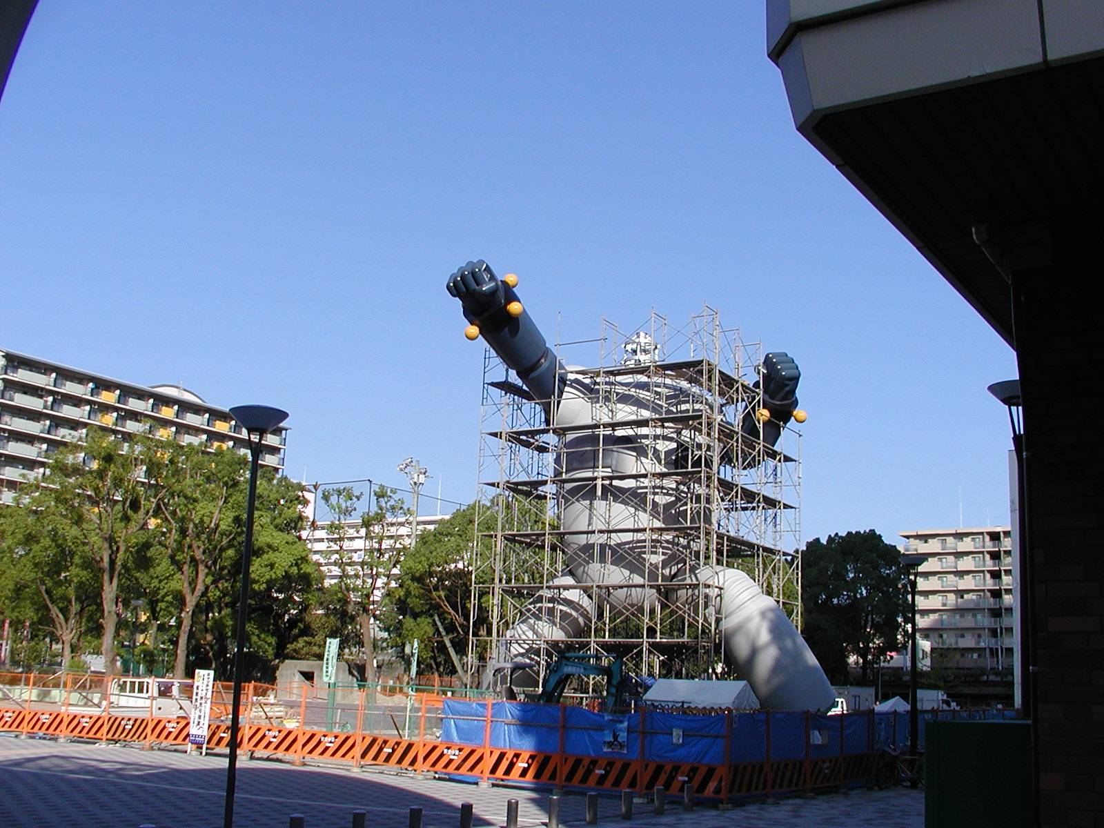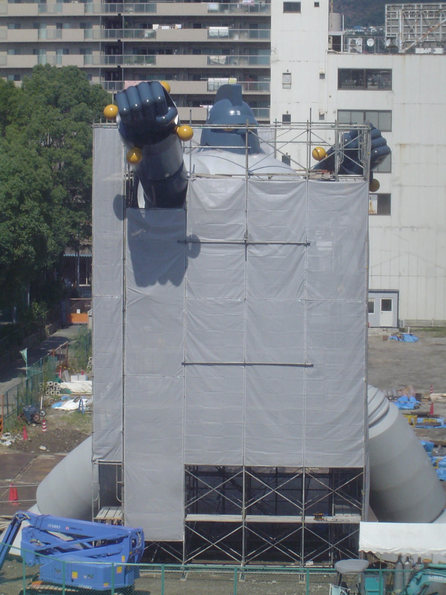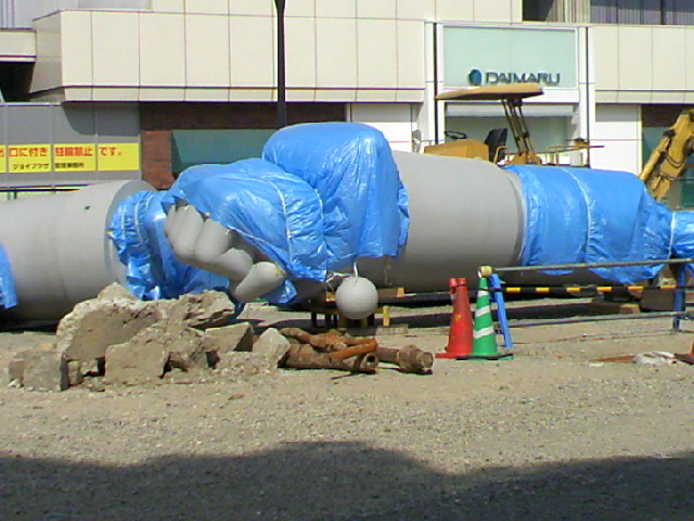 近所だったので見てきました。 公園横の、以前はお店とかが並んでいた場所なんですが、この通り更地になり、腕とか足とかのパーツがブルーシートにくるまれて、野晒し状態的にゴロゴロと。 ニュースなどで大写しされたあの頭部が何処にあるのかなーと思い、現場周辺を少しウロウロ探してみたんですが、どうも頭部は「別待遇」で何処かに保管でもされているらしく。 見える範囲にはありませんでした。 それと、現時点で塗装が完了しているのは、どうやら頭部だけの様子です。 野晒しな他のパーツは、白っぽい下地塗装のままでした。 全ての塗装が終わるのがいつなのか、頭部が何処に行ったのか。 気になるので今後もチェックしに行ってみます。