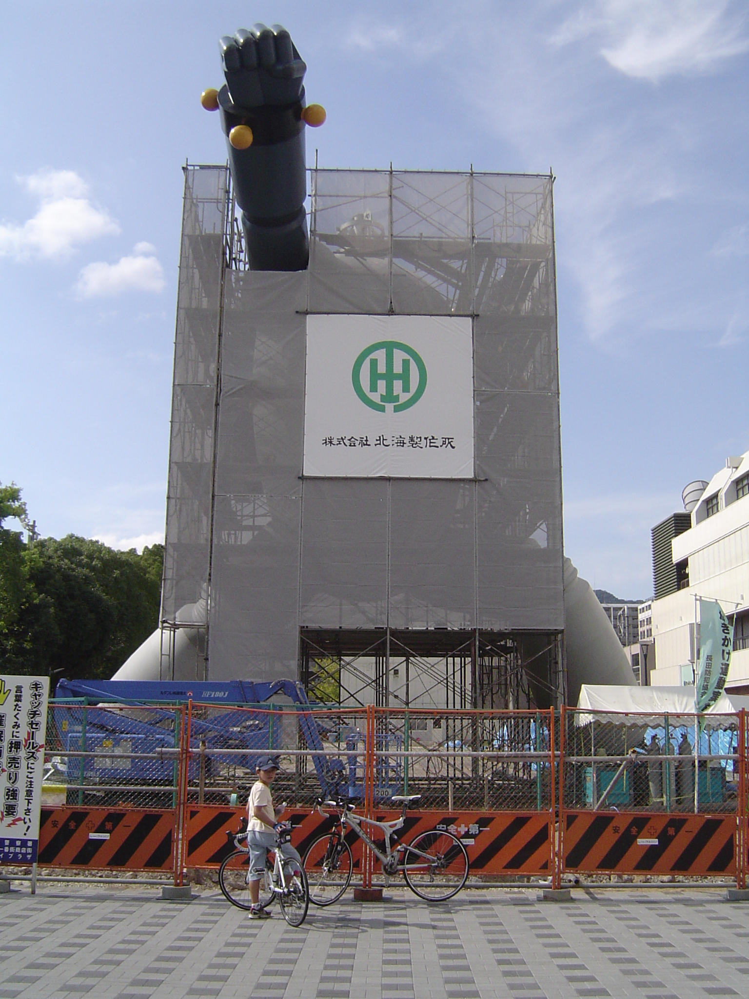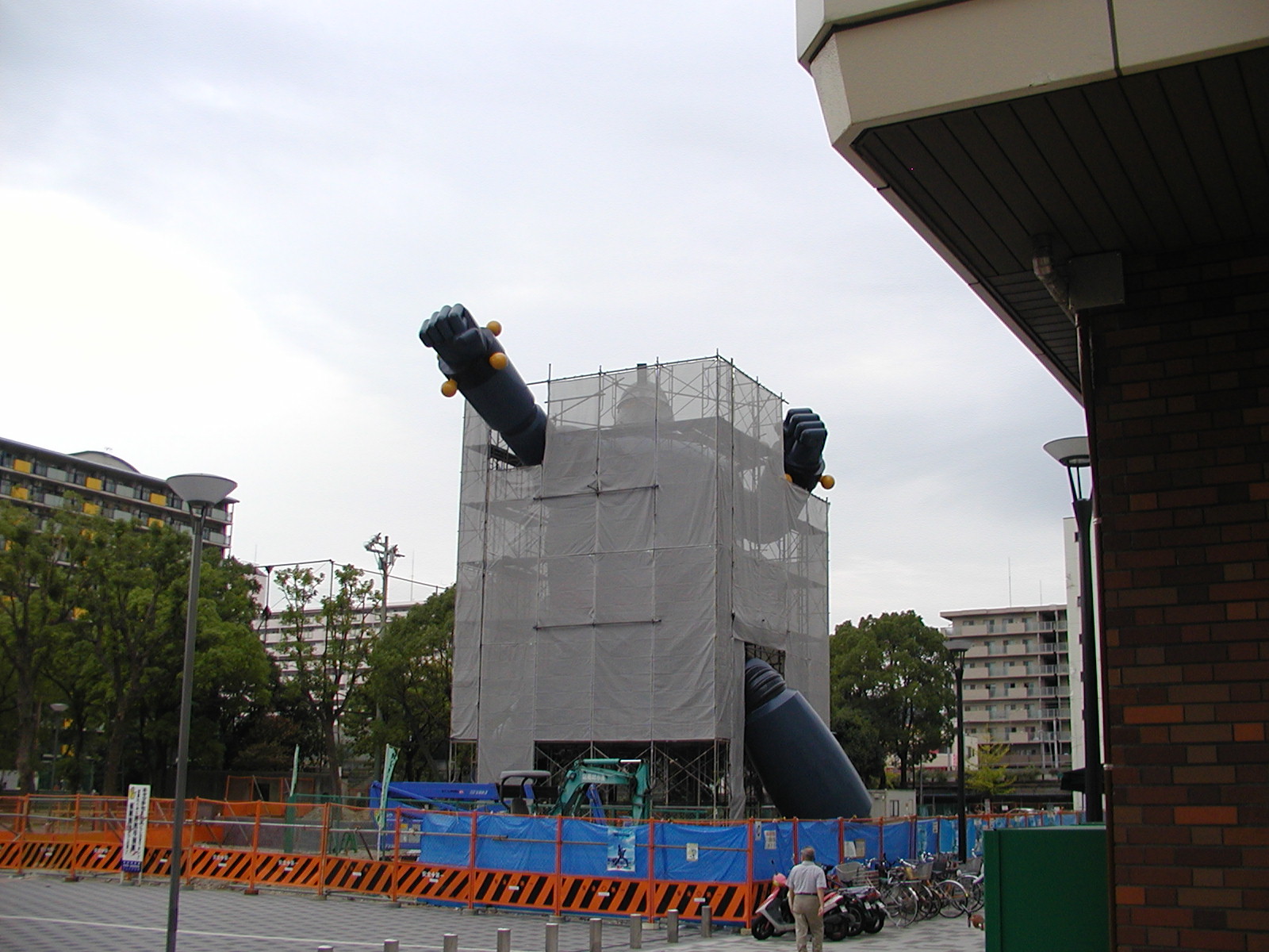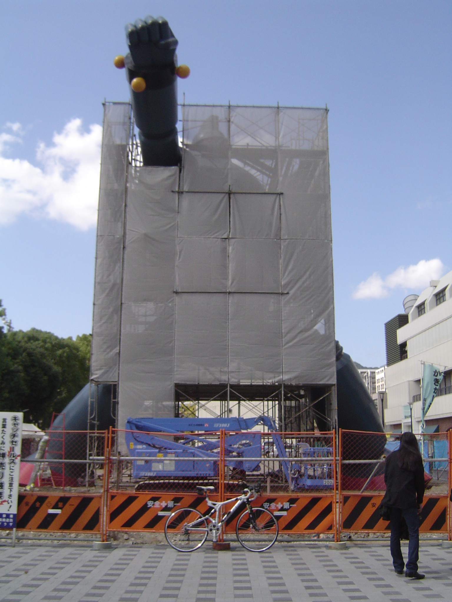 近所だったので見てきました。 公園横の、以前はお店とかが並んでいた場所なんですが、この通り更地になり、腕とか足とかのパーツがブルーシートにくるまれて、野晒し状態的にゴロゴロと。 ニュースなどで大写しされたあの頭部が何処にあるのかなーと思い、現場周辺を少しウロウロ探してみたんですが、どうも頭部は「別待遇」で何処かに保管でもされているらしく。 見える範囲にはありませんでした。 それと、現時点で塗装が完了しているのは、どうやら頭部だけの様子です。 野晒しな他のパーツは、白っぽい下地塗装のままでした。 全ての塗装が終わるのがいつなのか、頭部が何処に行ったのか。 気になるので今後もチェックしに行ってみます。
