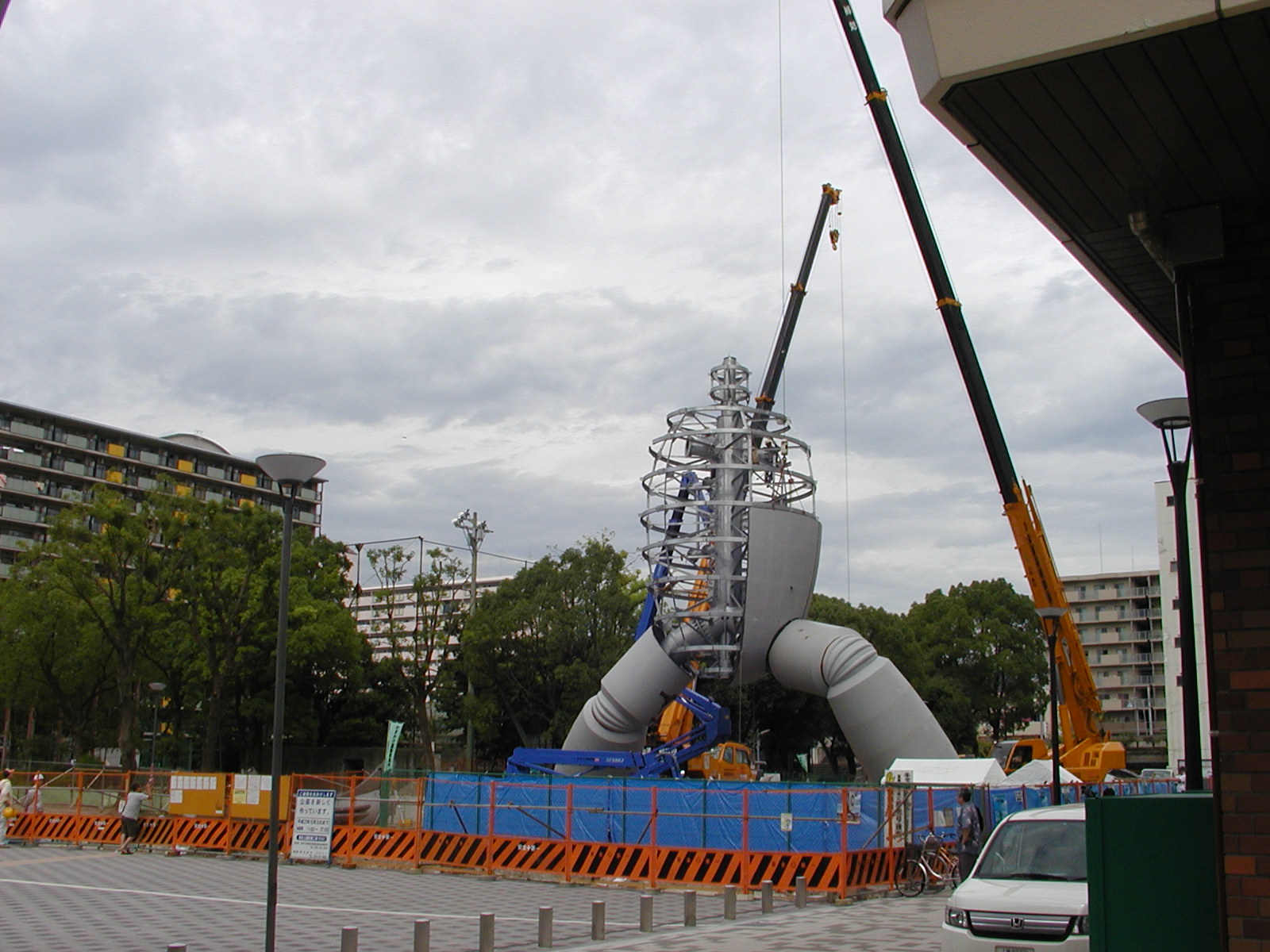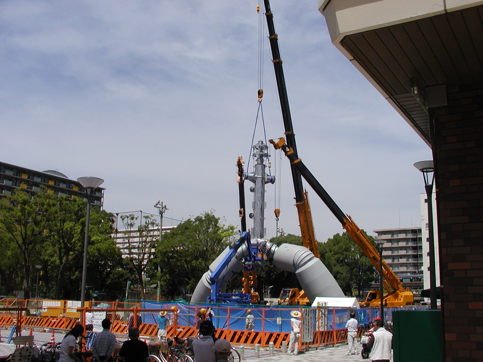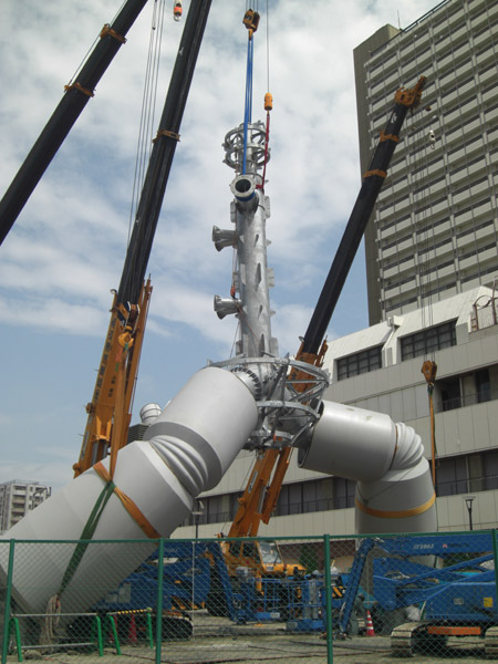 8月12日には鉄人の背骨部分にあたる金属が組み立てられました。今回は運良く作業中の写真を撮ることが出来ました。3台のクレーン車で慎重に作業が行われていました。
