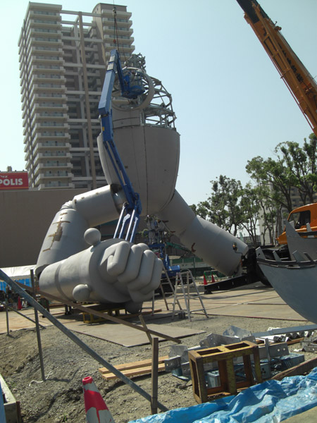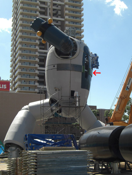 19日午後の写真です。 前日に取り付けられた上半身の背中側に、ロケットエンジン設置用の穴があけられました。 それと取り付けはまだだけど、両腕の塗装が完了しています(前日に見た時には、作業の人達が手塗りでぺたぺたと塗ってる最中でした)。 本当に、ここ数日は作業が一気に進んでいるような印象がありますね。