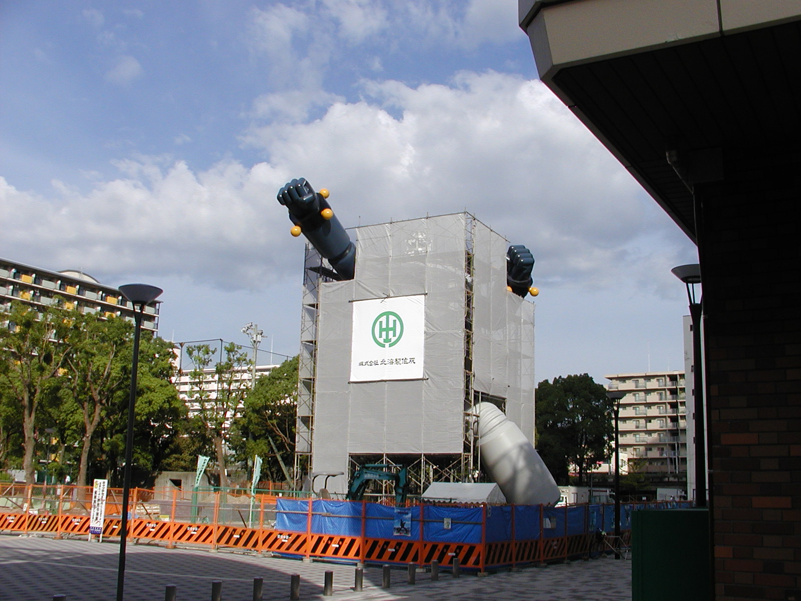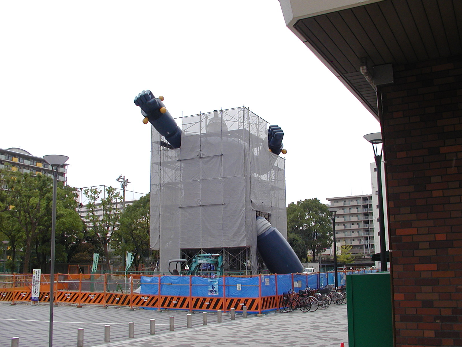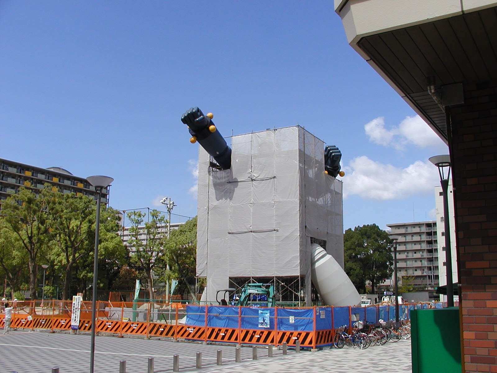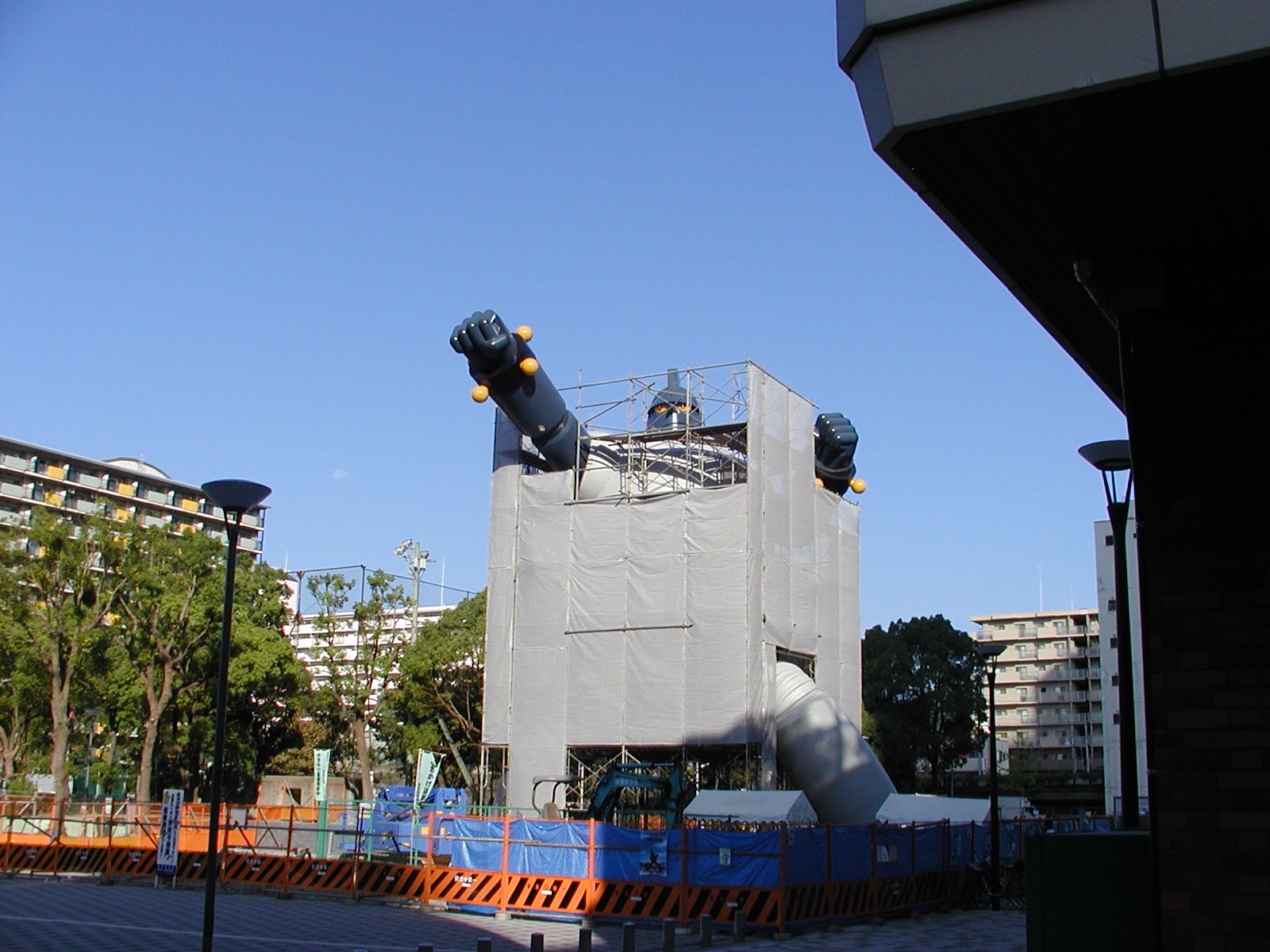 足場の周囲に布がはられました。鉄人が、囲いの中から突き破って出てこようとしているようにも見えます。
