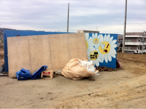震災の被害を受け改築工事中でした。(それと除染も。)児童は隣の泉丘中に間借りをして授業を行っているそうです。しかし、壁は健在。イラストはゴレンジャーではなくハマギクと思われる花の絵になっていました。私も子どもの頃、自転車をぶつけて遊んだりだいぶ罰あたりなことをした覚えがありますが、いまだ立っているとはうれしい限りです。