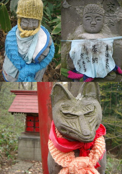 円山にはたまに登ります。 寒い季節だとお地蔵さんに手編みらしきマフラーが巻かれていて、 そのコーディネートはなかなか可愛らしいです。 これは数年前の写真ですが、この時は登山道入口付近の おいなりさんにまで巻かれていました。 誰かマメな人が着せ替えてるっぽいので、 今も新しいマフラーをしているのではないでしょうか。