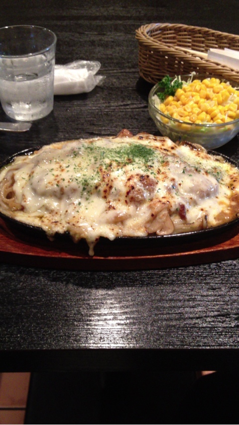今回は、豚カツが乗ってるボリューム満点の焼きチーズカレーナポリタンを注文。サラダととろけるチーズと豚カツとカレーは、見た目で圧倒される量。その大味な三重攻撃ですぐにお腹いっぱいになりました。