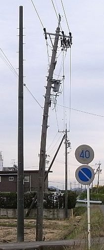 辺りを見回してみましたが、写真に写した2本の電柱が目立ってかしいでいて、下のKIRA KIRA CAFEの前の電柱の方が、傾きが大きい様です。