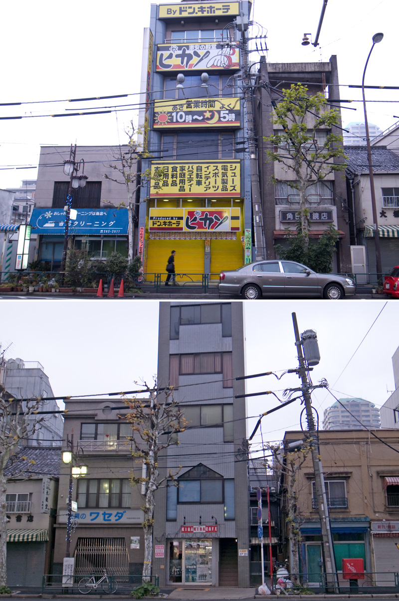 写真上が、ピカソのビルとその前の電柱、下の写真がピカソから3軒はさんで早稲田駅寄りにあるKIRA KIRA CAFEのビルとその前の電柱です。