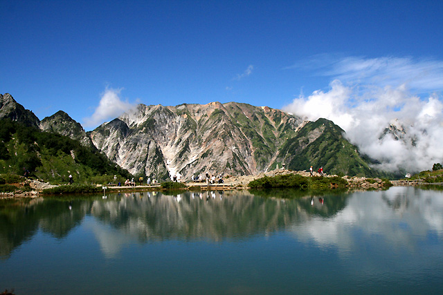 べたな写真ですが、八方池と白馬三山です。 ガスが上がってくるのが早いので、なかなかガスが無く、無風の状態で見ることは出来ないのですが、リベンジできることを祈ってます。