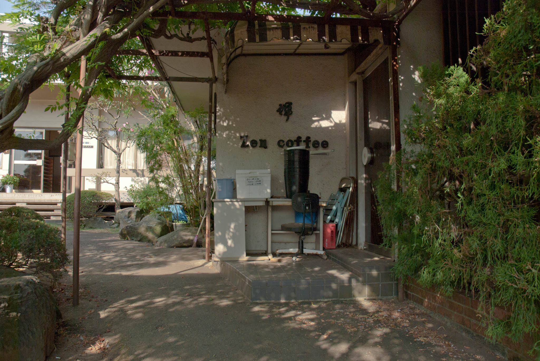 投稿中でポイントされている本妙寺にはお墓は無いので土浦城周辺の他のお寺を幾つか廻って見た所,神龍寺境内に「Zen coffee」という喫茶店風の建物がありました。少し店の名前が違いますが,こちらの事でしょうか。こちらの「Zen coffee」さんの店内は現状物置として使用されている様で,少なくとも現在は営業されていない様です。