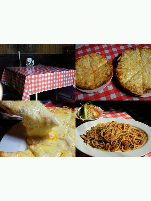 お店の名物ピザとナポリタンです。 左がSサイズ、右がMサイズ。 チーズの量が半端ないです。 ナポリタンなのにミートソースをあえた感じの 不思議なスパゲッティも美味しかったです。 写真が小さくなってしまってごめんなさい。