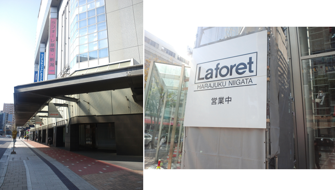 近所なので行ってきました。 ラフォーレ原宿・新潟はNEXT21というビルの1〜4Fに入っています。 なので、それほど目立つような看板がありません。 外から見えるのはこの程度です。 中は1〜2Fへのエスカレーターのうち1基だけスパイラルエスカレーターです。