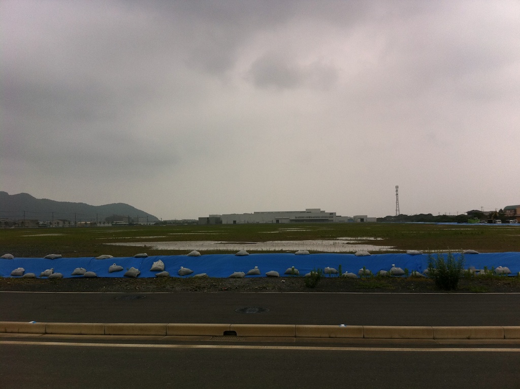 こちらは滑走路跡地の北側に出来た道路から南西方向を見た図。造成中の工業団地にしか見えませんが、真ん中奥に管制塔だった建物が見えますね。